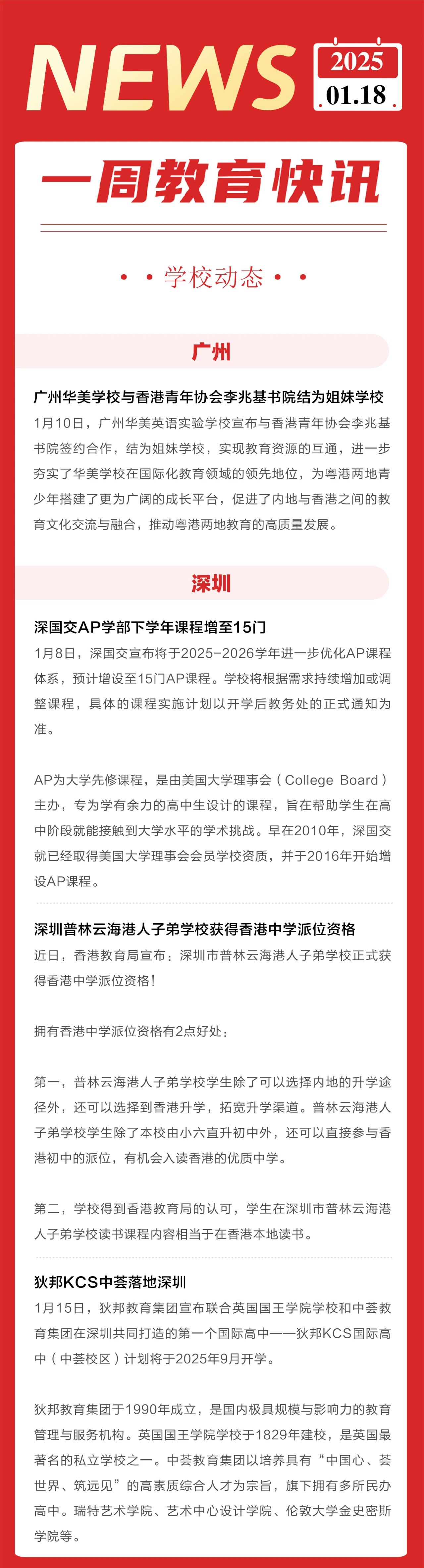 學校動態 廣州 廣州華美學校與香港青年協會李兆基書院結為姐妹學校 1月10日,廣州華美英語實驗學校宣布與香港青年協會李兆基書院簽約合作,結為姐妹學校,實現教育資源的互通,進一步夯實了華美學校在國際化教育領域的領先地位,為粵港兩地青少年搭建了更為廣闊的成長平臺,促進了內地與香港之間的教育文化交流與融合,推動粵港兩地教育的高質量發展。 深圳 深國交AP學部下學年課程增至15門 1月8日,深國交宣布將于2025-2026學年進一步優化AP課程體系,預計增設至15門AP課程。學校將根據需求持續增加或調整課程,具體的課程實施計劃以開學后教務處的正式通知為準。 AP為大學先修課程,是由美國大學理事會(College Board)主辦,專為學有余力的高中生設計的課程,旨在幫助學生在高中階段就能接觸到大學水平的學術挑戰。早在2010年,深國交就已經取得美國大學理事會會員學校資質,并于2016年開始增設AP課程。 深圳普林云海港人子弟學校獲得香港中學派位資格 近日,香港教育局宣布:深圳市普林云海港人子弟學校正式獲得香港中學派位資格! 擁有香港中學派位資格有2點好處: 第一,普林云海港人子弟學校學生除了可以選擇內地的升學途徑外,還可以選擇到香港升學,拓寬升學渠道。普林云海港人子弟學校學生除了本校由小六直升初中外,還可以直接參與香港初中的派位,有機會入讀香港的優質中學。 第二,學校得到香港教育局的認可,學生在深圳市普林云海港人子弟學校讀書課程內容相當于在香港本地讀書。 狄邦KCS中薈落地深圳 1月15日,狄邦教育集團宣布聯合英國國王學院學校和中薈教育集團在深圳共同打造的第一個國際高中——狄邦KCS國際高中(中薈校區)計劃將于2025年9月開學。